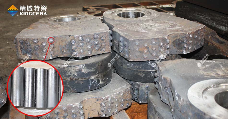 碳化鈦基金屬陶瓷棒是以碳化鈦(TiC) 為硬質(zhì)相,高錳鋼及其他金屬粉末為粘結(jié)相,再適當(dāng)配入相應(yīng)的合金元素,用粉末冶金方法生產(chǎn)的一種硬質(zhì)合金材料,可廣泛應(yīng)用于礦山,水泥、制砂等各種沖擊工況行業(yè)等,其中牌號TM52被廣泛應(yīng)用在破碎機(jī)耐磨件上,采用熔融的高錳鋼液澆鑄,將合金棒鑲鑄在耐磨件的工作面,二者產(chǎn)生牢固的冶金結(jié)合,制備成復(fù)合耐磨件,有效減少了基體材料高錳鋼的磨損,維修量和更換量顯著減少,從而降低了備件費用,提高了破碎比和出料率。