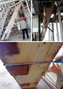 如圖所示,這個(gè)下料溜槽磨損嚴(yán)重,以前采用的8mm厚的普通鋼板,不到1年就磨穿了。高度近7米,斜面長(zhǎng)近9米,落差高,顆粒大,爐渣內(nèi)有10mm左右的大顆粒,因?yàn)樵豪镉忻喉肥瘺](méi)有被完全燃燒,所以造成溜槽底側(cè)嚴(yán)重漏粉,經(jīng)常被磨穿。了解到這些情況后,湖南精城特種陶瓷有限公司的技術(shù)專(zhuān)家結(jié)合現(xiàn)場(chǎng)的工況,給出了解決方案,整體分段制作溜槽,在每段流槽的磨損面粘貼精城牌大塊厚瓷(NMC-G耐磨陶瓷),各段之間采用法蘭連接,此方案經(jīng)濟(jì)又環(huán)保,使用壽命在6年以上。